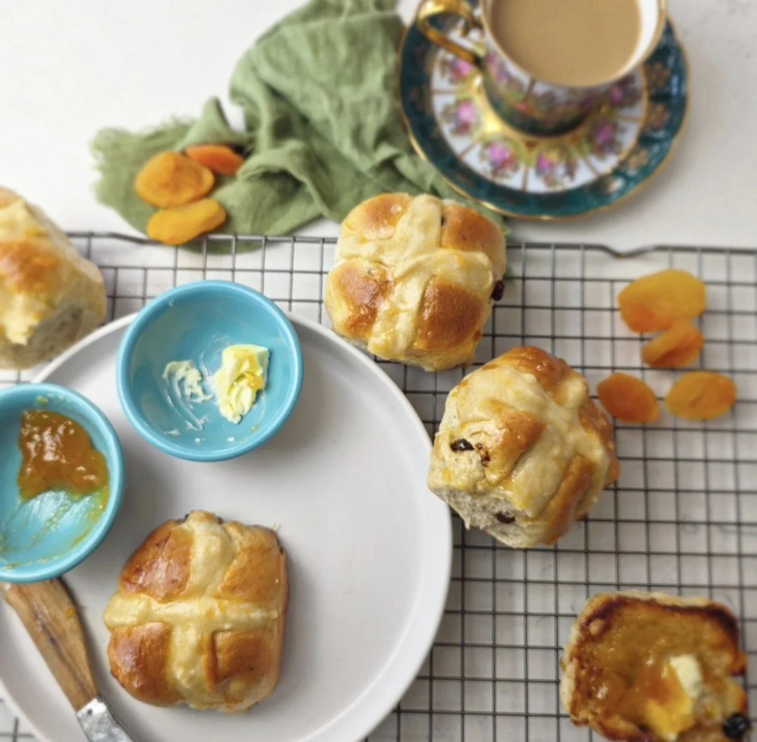 Soft, spiced hot cross buns with diced apricots and a shiny apricot glaze. Perfect for Easter, brunch, or anytime you want a special treat. Lightly toast for best flavor and serve with butter or jam.