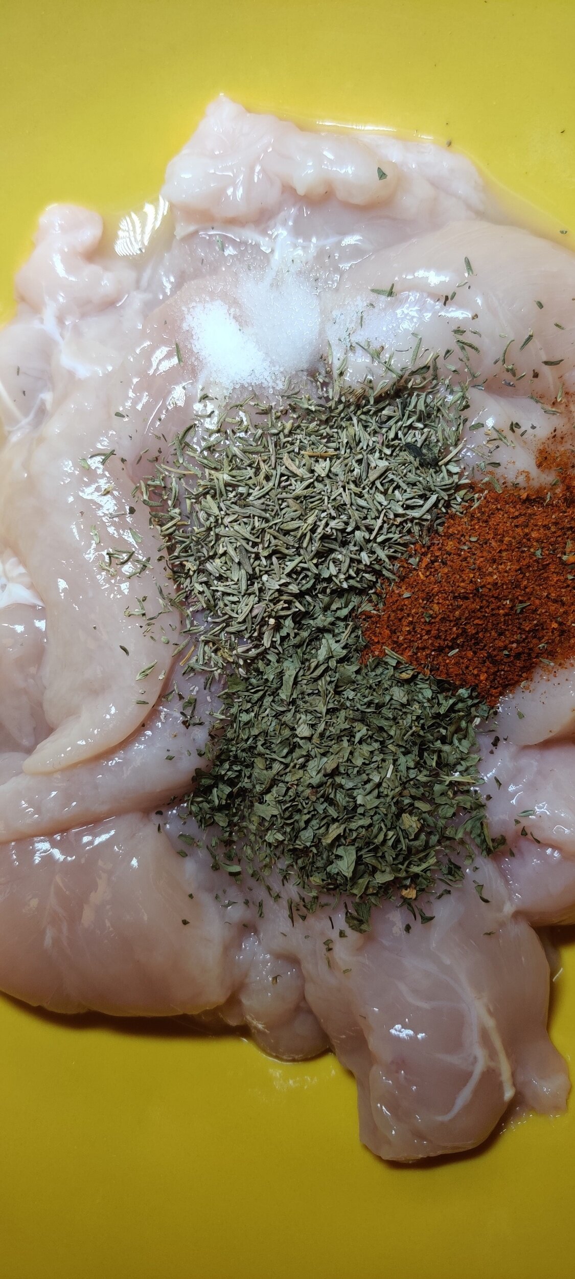 - Add thyme, parsley, paprika, black pepper, and salt. Toss until the tenders are evenly coated.